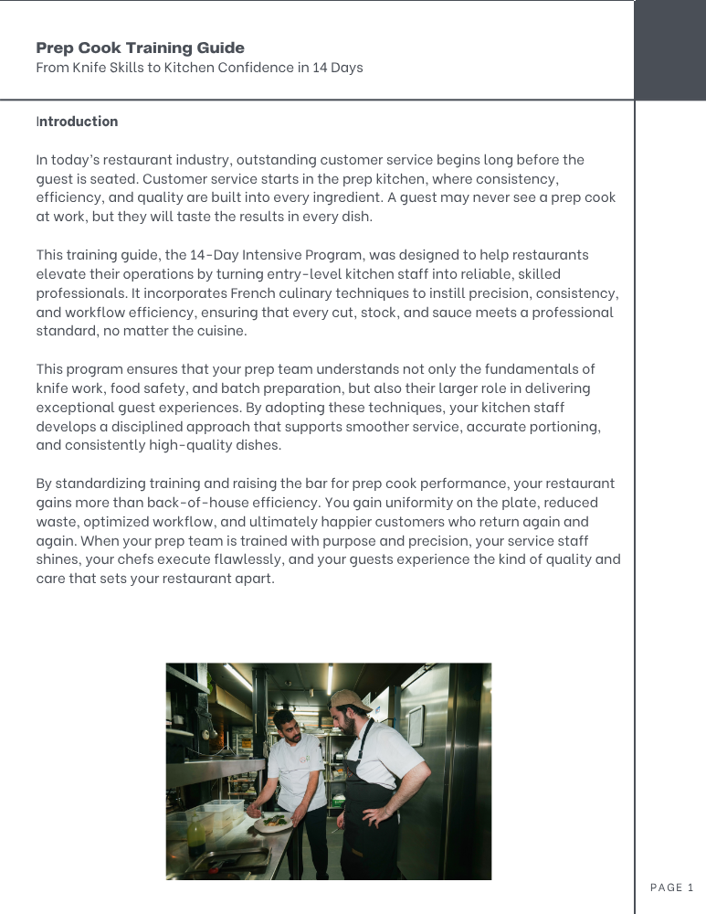 This guide doesn’t just teach cooking; it builds a mindset of accountability, precision, and pride in execution. Restaurant owners benefit from better service flow, faster onboarding, and reduced turnover as cooks gain the skills and confidence to perform under pressure. With clearly defined standards and repeatable systems, the Line Cook Training Guide helps you create a kitchen culture where every cook works clean, communicates effectively, and contributes to a consistently excellent guest experience.