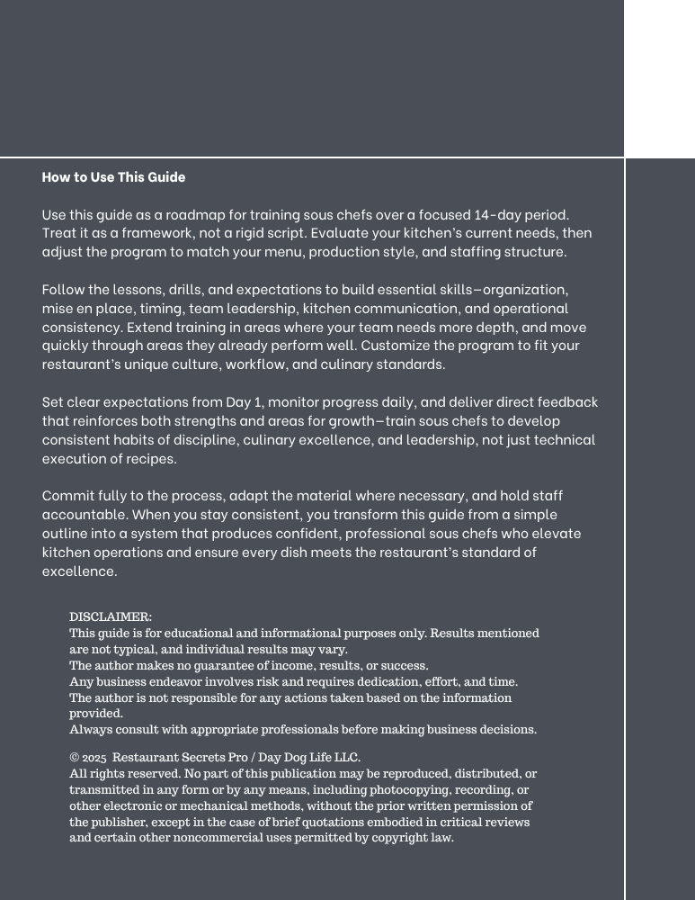 Beyond technical mastery, this guide trains sous chefs to lead with emotional intelligence and composure under pressure. Owners gain the peace of mind that comes from knowing their team has a reliable second leader who can manage people, anticipate problems, and uphold the restaurant’s standards without constant oversight. With this guide, you build not just stronger cooks but stronger leaders—professionals who can maintain your brand, support the executive chef, and drive long-term operational excellence.